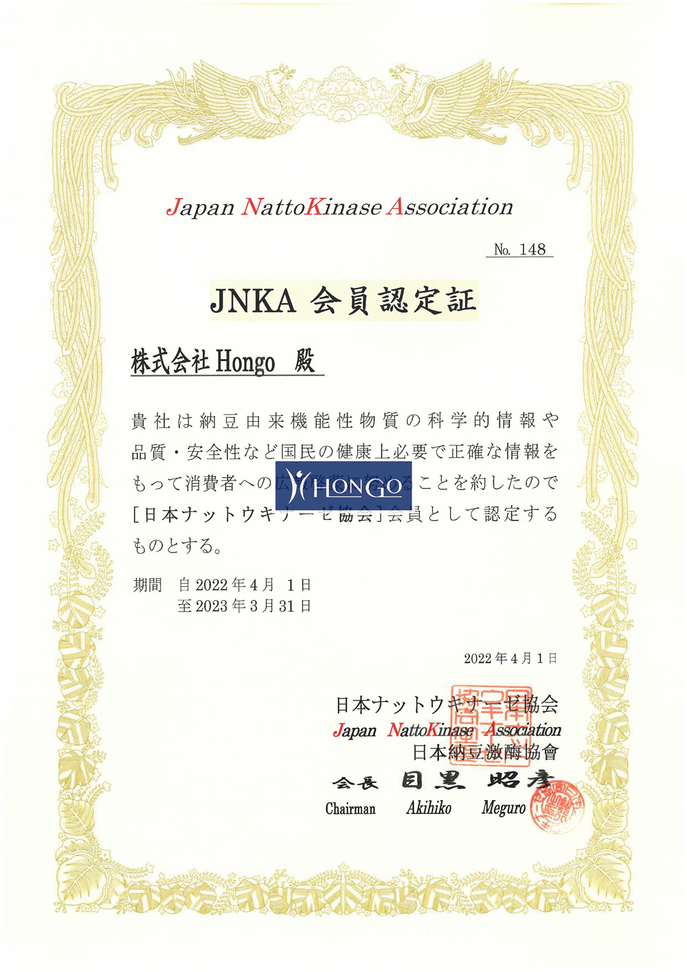 Giấy chứng nhận "JNKA” của hiệp hội NATTOKINASE Nhật Bản Hongo Co., Ltd. / Nhật Bản (Nhập khẩu trực tiếp, sản phẩm có chứng nhận "JNKA” của hiệp hội NATTOKINASE Nhật Bản)
